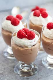 Rich chocolate mousse cups, elegantly topped with whipped cream and fresh fruit.