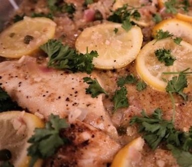marinated boneless chicken in a lemon and caper sauce with fresh lemon slice garnish
