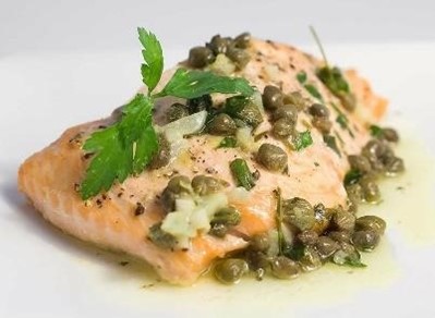 beautiful portion of baked salmon in a lemon-butter caper sauce, sprinkled with dill