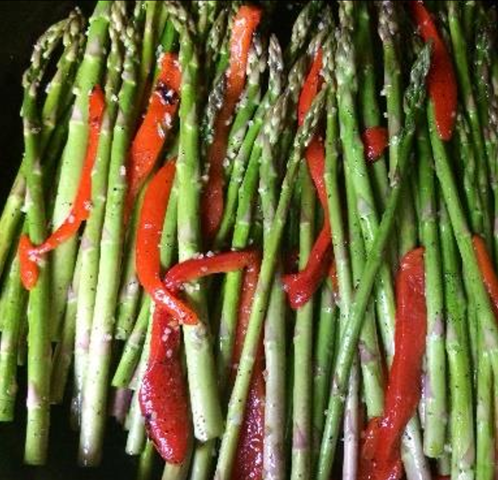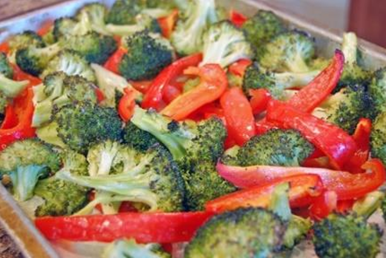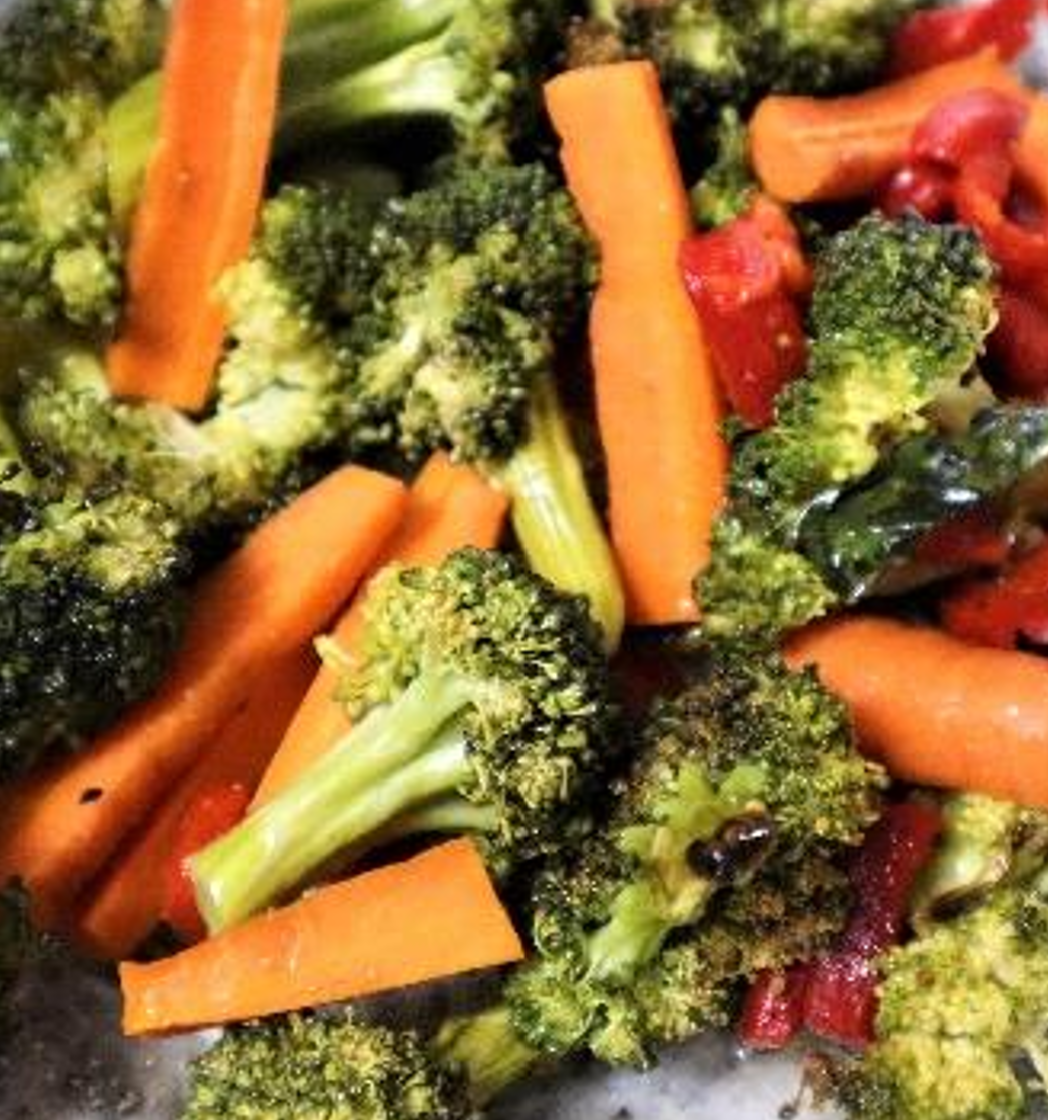 A delicious blend of roasted broccoli and carrots, with optional roasted red peppers