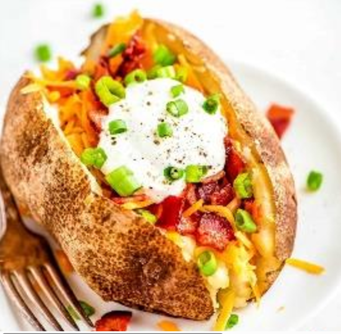 A fluffy, oven-baked potato served with sour cream, butter, and chives