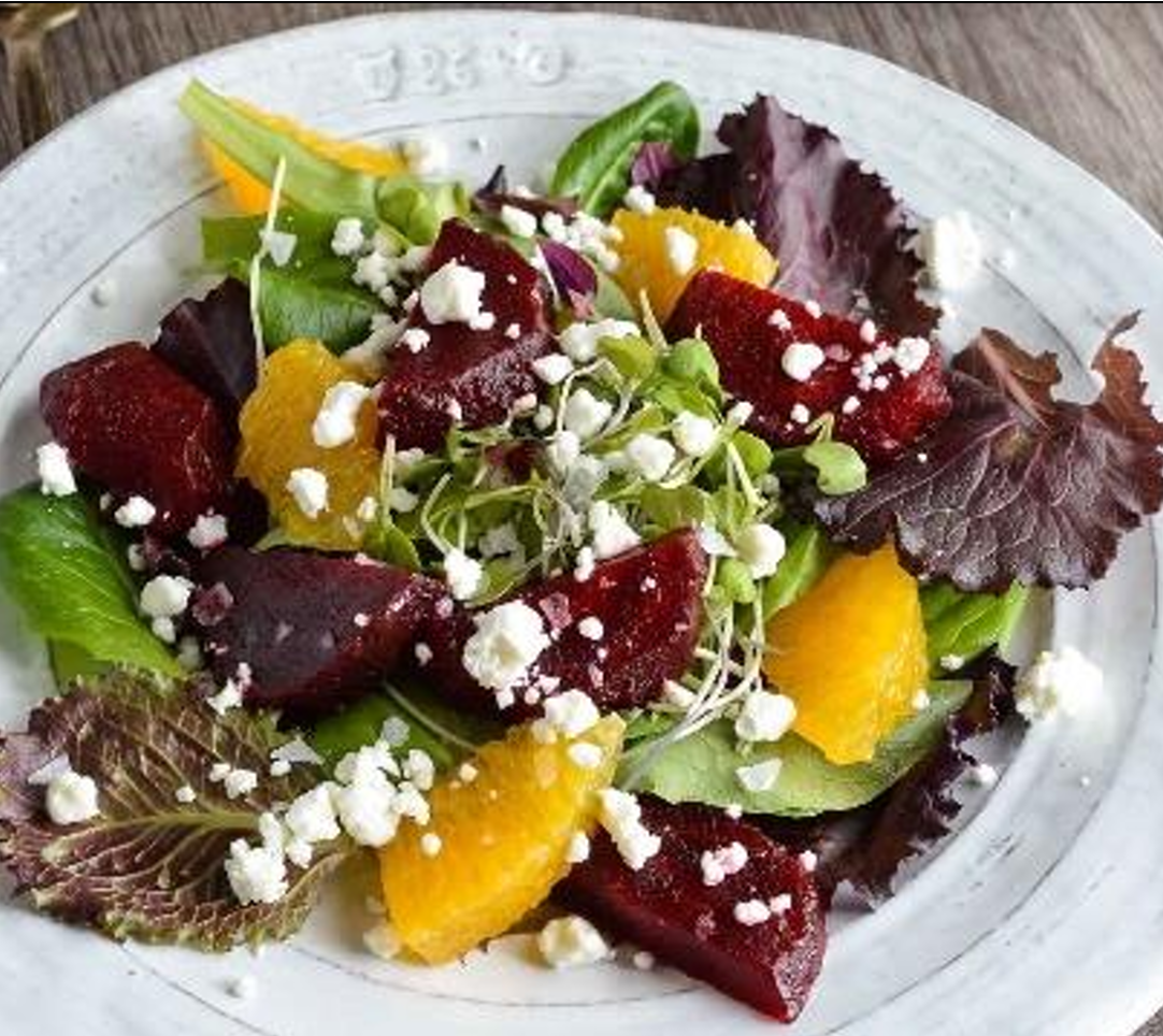Sliced roasted red beets, mandarin oranges, pistachios and goat cheese over mixed greens, served with a raspberry vinaigrette