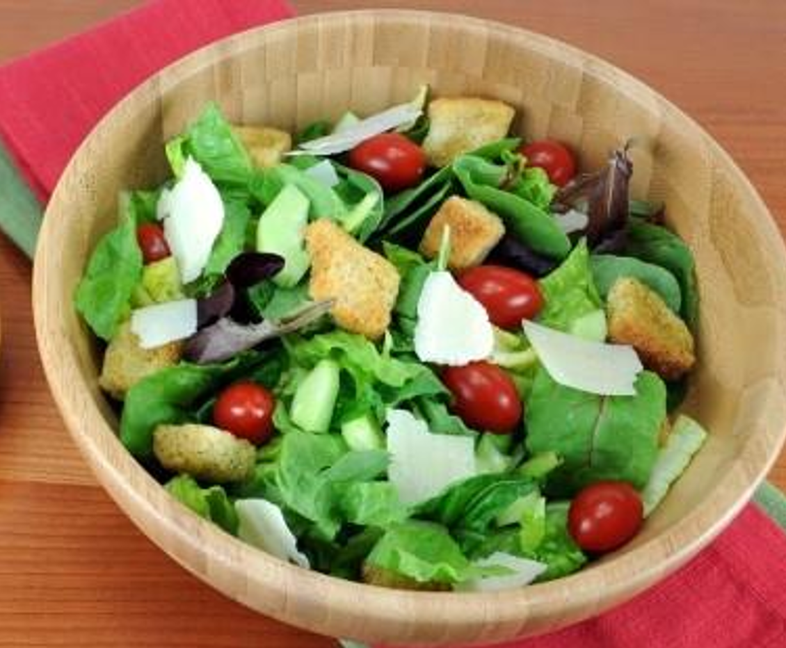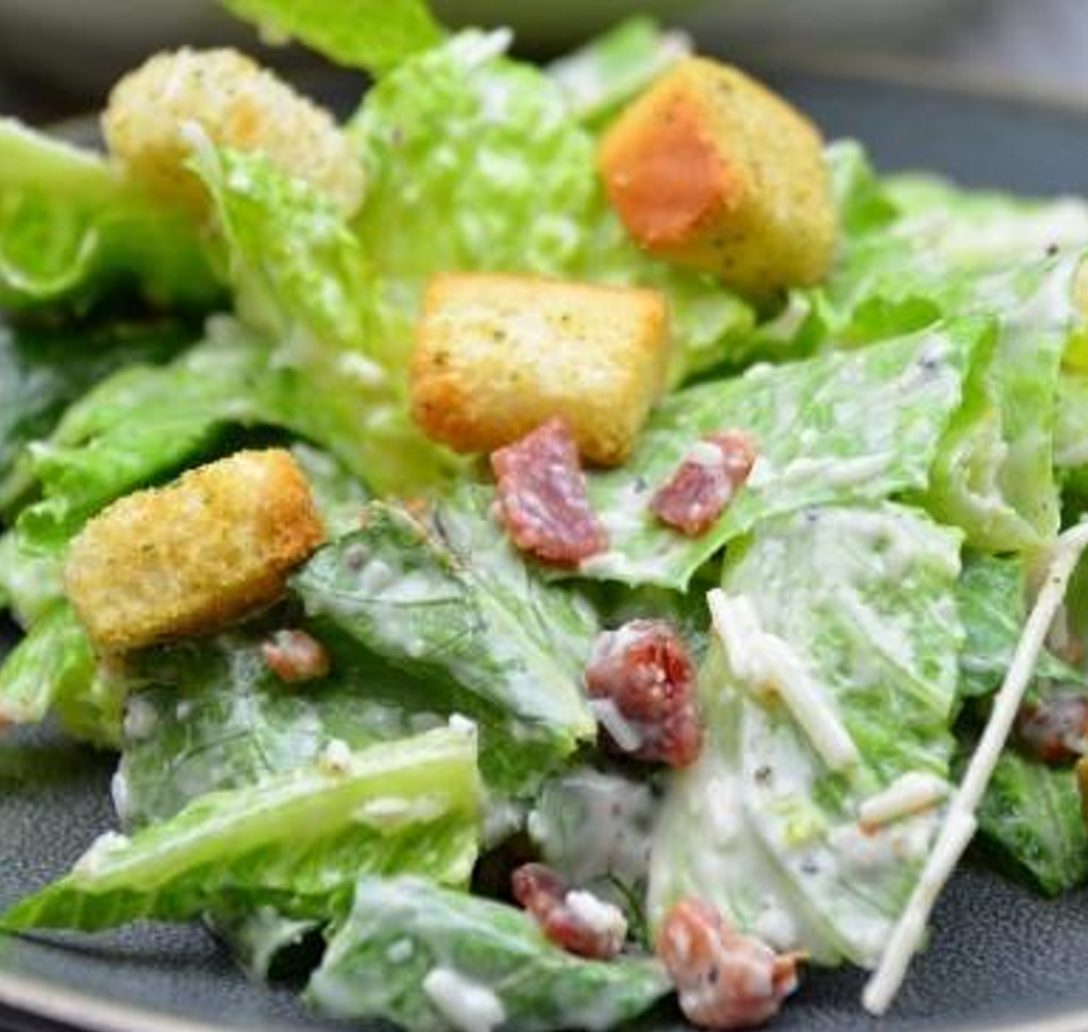 Fresh romaine lettuce, bacon pieces, croutons and shaved parmesan cheese tossed with Caesar dressing