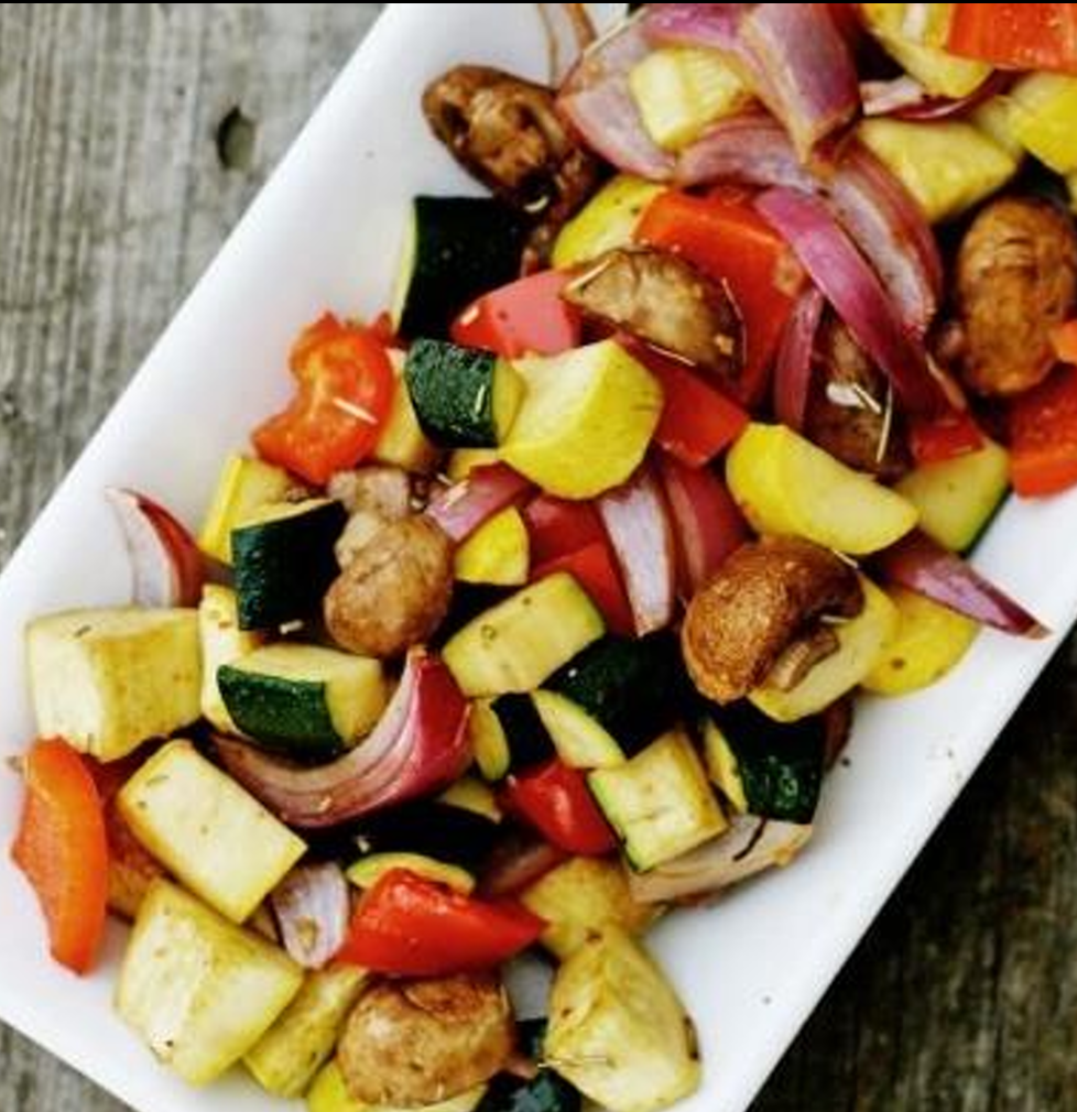 Vibrant, fresh medley of green and yellow summer squash, mushrooms, onions, roasted red peppers, artichoke hearts and sun-dried tomatoes